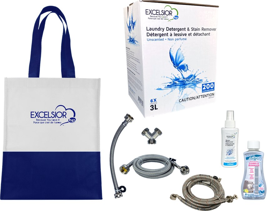 La trousse de produits essentiels pour la laveuse Excelsior HE est une solution pratique tout-en-un! Le sac contient: détergent à lessive (3L), détachant à lessive (120 ml), nettoyeur et désodorisant pour laveuse (250 ml) et tuyaux pour laveuse et sécheuse.Read More